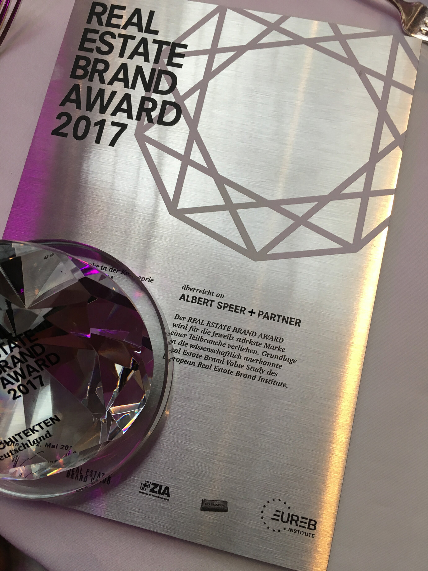 Das Frankfurter Unternehmen weist damit gemäß der Brand Value Study 2017 des European Real Estate Brand Institute erneut den stärksten Markenwert der Archi­tek­tur­büros im deutschen Markt auf und durfte am 12. Mai in Berlin einen der begehrten „Diamanten“ entgegennehmen.