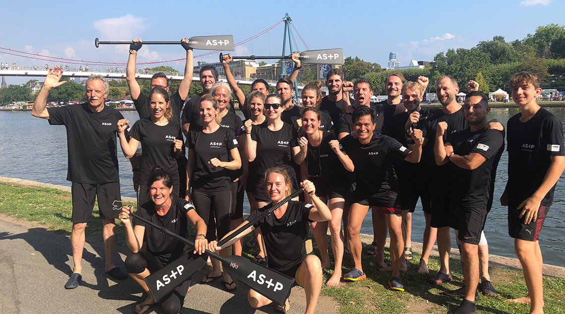 Die Rennstrecke des zweitältesten Drachenbootwettkampfs in Deutschland verläuft von der Untermainbrücke bis zum Holbeinsteg. Dieses Jahr nahmen insgesamt etwa 60 Teams in den Klassen Mixed-Fun, Open-Cup, Mixed, Mixed-Sport und Damen-Cup am Rennen teil. Jetzt heißt es für die Mannschaft: Warten auf den nächsten Sommer, dann wird wieder auf dem Main trainiert. Sport wird bei AS+P traditionell großgeschrieben, so nehmen die Mitarbeiter auch am J. P. Morgan Chase Challenge oder an Fußballturnieren teil oder profitieren von Angeboten wie JobRad, Fitness oder Yoga.