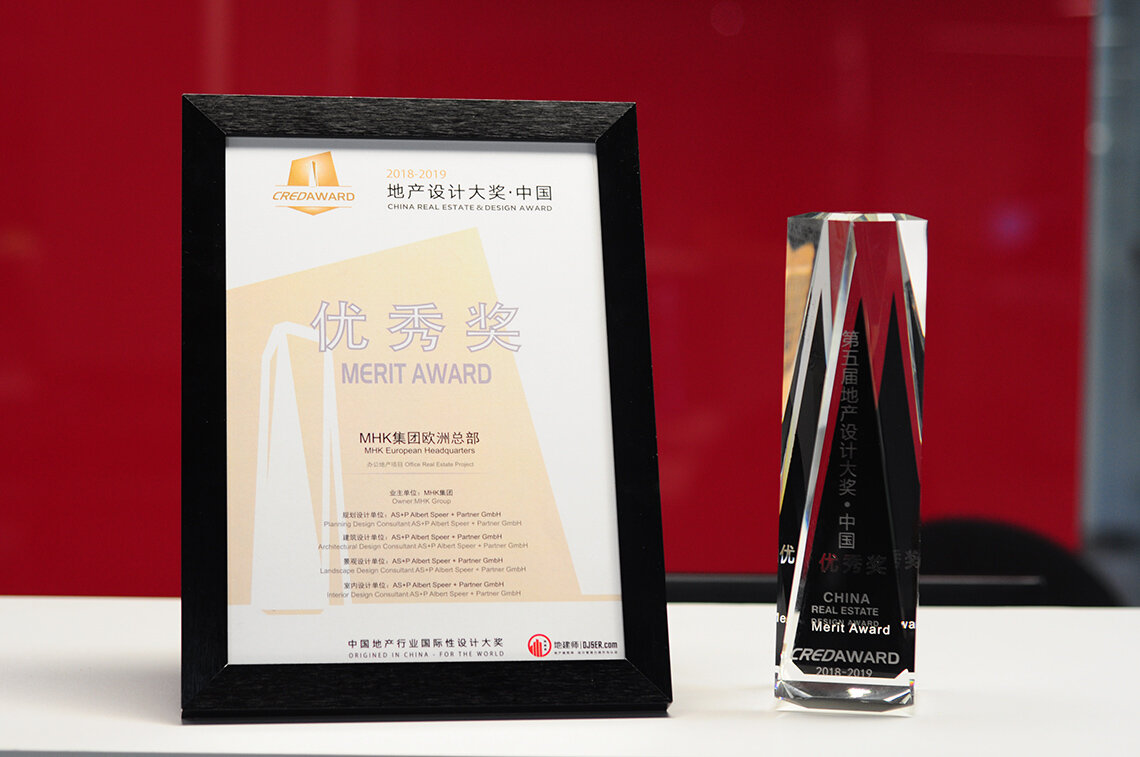 Die Verleihung des „5th CREDAWARD“ fand am Samstagabend, dem 27. April, im Pudong Kerry Hotel in Shanghai statt. Vor Ort waren Johannes Dell, Geschäftsführer der AS+P Architects Consulting Co., Ltd. und Kathrin Gallus, Assoziierte Partnerin bei AS+P und verantwortliche Architektin der neuen Europazentrale für die MHK Group in Dreieich, Deutschland, um die Auszeichnung auch im Namen des Auftraggebers entgegenzunehmen. Der Merit Award wird im Rahmen des China Real Estate Design Award verliehen und würdigt herausragende Architekturprojekte mit Blick auf die Anforderungen des Immobilienmarktes, des urbanen Raums und der Gesellschaft. In der Jury saßen unter anderem Geschäftsführer namhafter Design-Hersteller und Akteure aus der Immobilienwirtschaft.