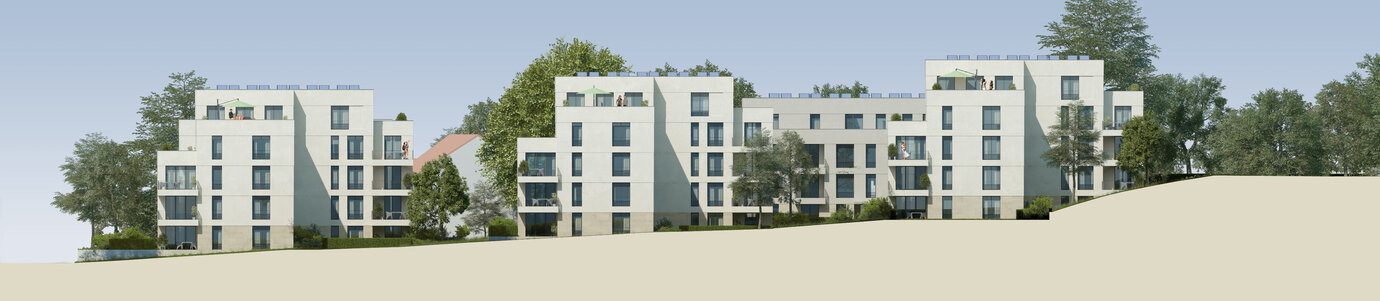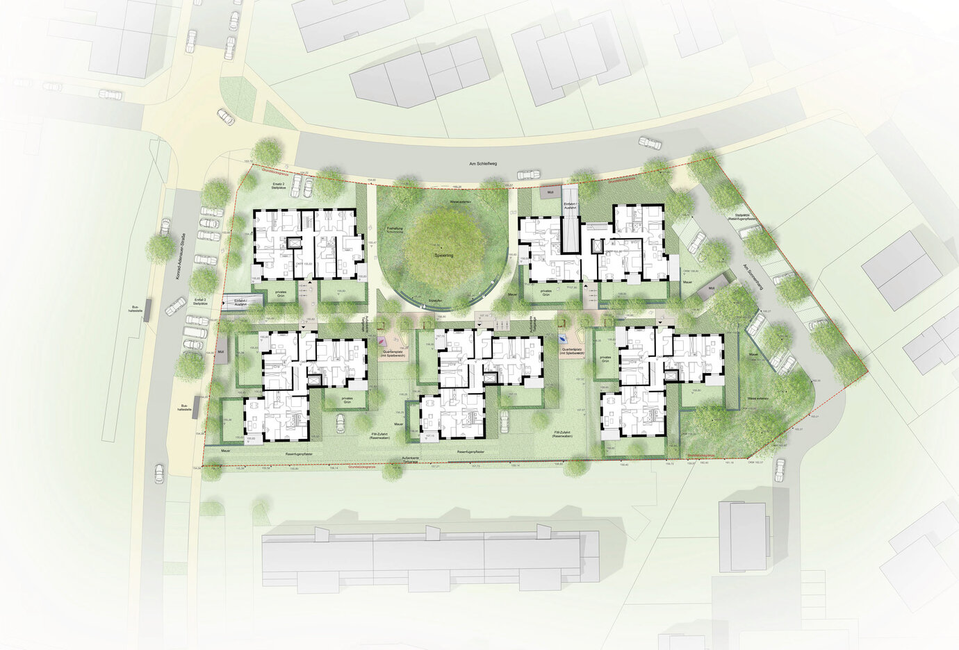 Mit seiner Maßstäblichkeit, Geschossigkeit und Gebäude­ausrichtung fügt sich der städtebauliche Entwurf gut in die bestehende Bebauung ein. Es wird ausschließlich Geschoss­wohnungs­bau im Passivhausstandard angeboten, wobei die Zielgruppen durchaus vielfältig sein können und sollen. Von der Familie mit Kindern bis zu dem Seniorenehepaar kann hier jeder eine geeignete Wohnung finden. Alle fünf Gebäude mit insgesamt 63 Wohn­einheiten sind barrierefrei erreichbar. Entlang eines Fußwegs der in West-Ostrichtung durch das Grundstück führt, wechseln sich die geplanten Baukörper mit hochwertigen Außenflächen ab. Der Speierling mit seinem im Durchmesser 26m großem Schutzbereich bildet dabei den zentralen Zugang. Die kleineren Quartiersplätze gliedern die Flächen zwischen den Gebäuden, dem Fußweg und den privateren, bzw. halböffentlichen Gartenzonen. Alle Gebäude werden fußläufig über den Fußweg erschlossen.