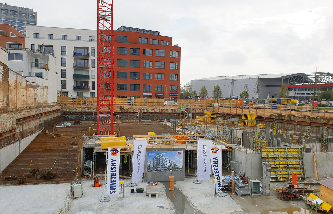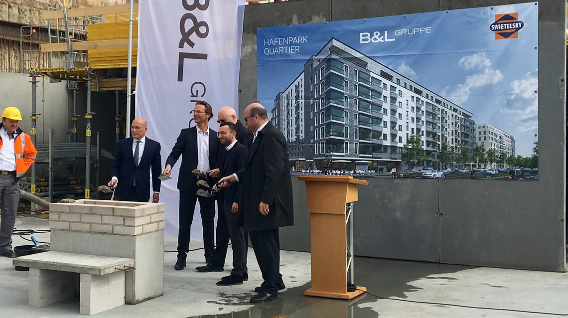 Am Mittwoch wurde der Baustart auf dem Areal des ehemaligen Osthafens in unmittelbarer Nähe zur Europäischen Zentralbank in Frankfurt am Main gefeiert. Planungsdezernent Mike Josef legte gemeinsam mit Martin Teigeler, Partner und Mitglied der Geschäftsleitung bei AS+P, Thorsten Testorp, geschäftsführender Gesellschafter der "B&L Gruppe" sowie Alf M. Prasch, Geschäftsführer des ebenfalls beteiligten Architekturbüros prasch buken partner architekten partG mbB, und Anton Prossliner, Geschäftsführer des Generalunternehmers SWIETELSKY Baugesellschaft, im Beisein von Pressevertretern und geladenen Gästen symbolisch den Grundstein.