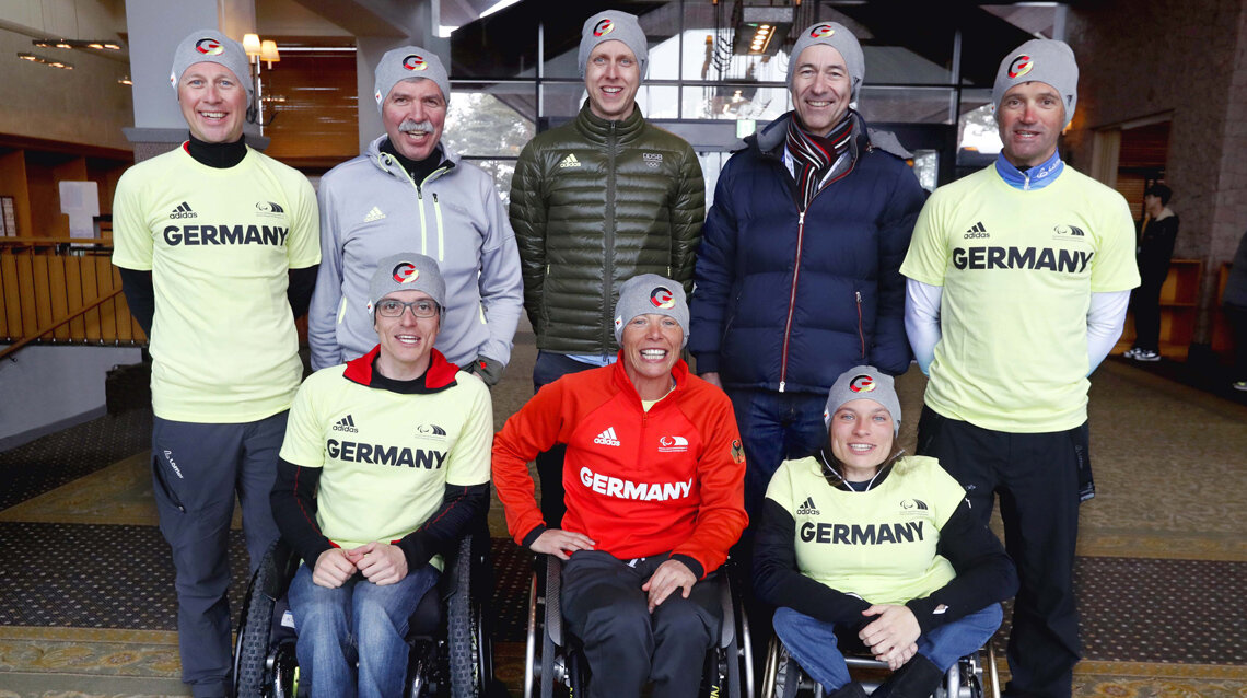 Obere Reihe v.l.: David Meiworm (Physiotherapeut paralympische Nationalmannschaft Ski Nordisch), Friedbert Greif (AS+P), Phillip Michler (PROPROJEKT), Thomas Dieckhoff (Deutsche Sport Marketing), Ralf Rombach (Bundestrainer paralympische Nationalmannschaft Ski Nordisch) Untere Reihe v.l.: Martin Fleig, Andrea Eskau, Anja Wicker (Paralympische Athleten) / Quelle: Picture-Alliance / Fotograf: Jeon Heon-Kyun
