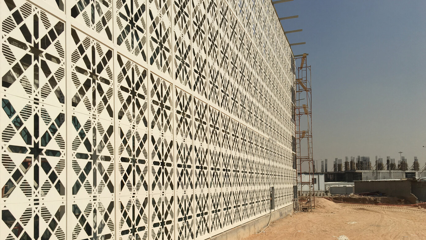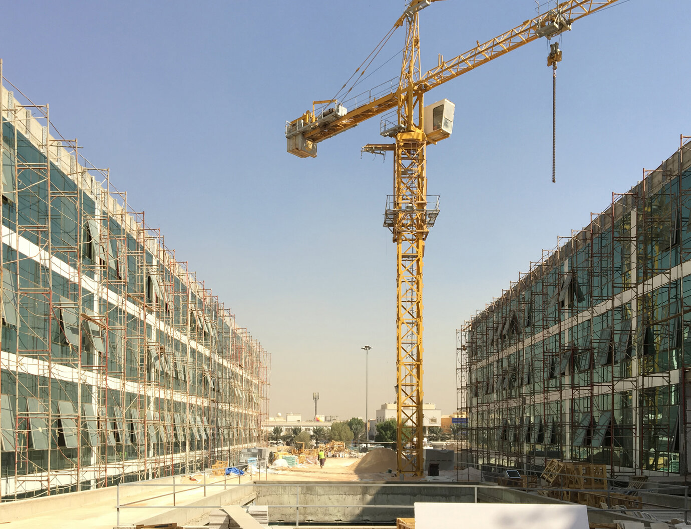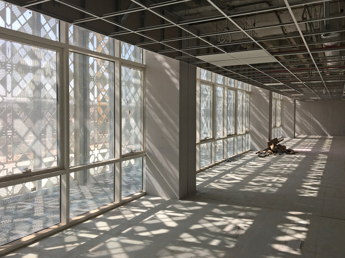 Nachdem das Projekt nach der Fertigstellung der Planung wegen der Neuausrichtung des Ministeriums zunächst ruhte, geht das neue Headquarter des ‘Ministry of Environment, Water and Agriculture‘ nun zügig seiner Fertigstellung entgegen. Die beiden Hauptbaukörper mit ihren jeweils drei Bürogeschossen sind bereits in der Ausbauphase. Lediglich das große Schattendach, das die beiden dreieckigen Trakte wieder zu einem Gesamtkomplex zusammenfasst, fehlt noch. Gut erkennbar ist bereits die Struktur mit den beiden Atrien und der großen Magistralen. Im Innenraum lässt sich schon jetzt das Lichtspiel der ornamentierten, vorgestellten Filterfassade erleben, die der Verschattung der eigentlichen Klimahülle dient und einen wesentlichen Beitrag zur Energieeffizienz des Gebäudes leistet.