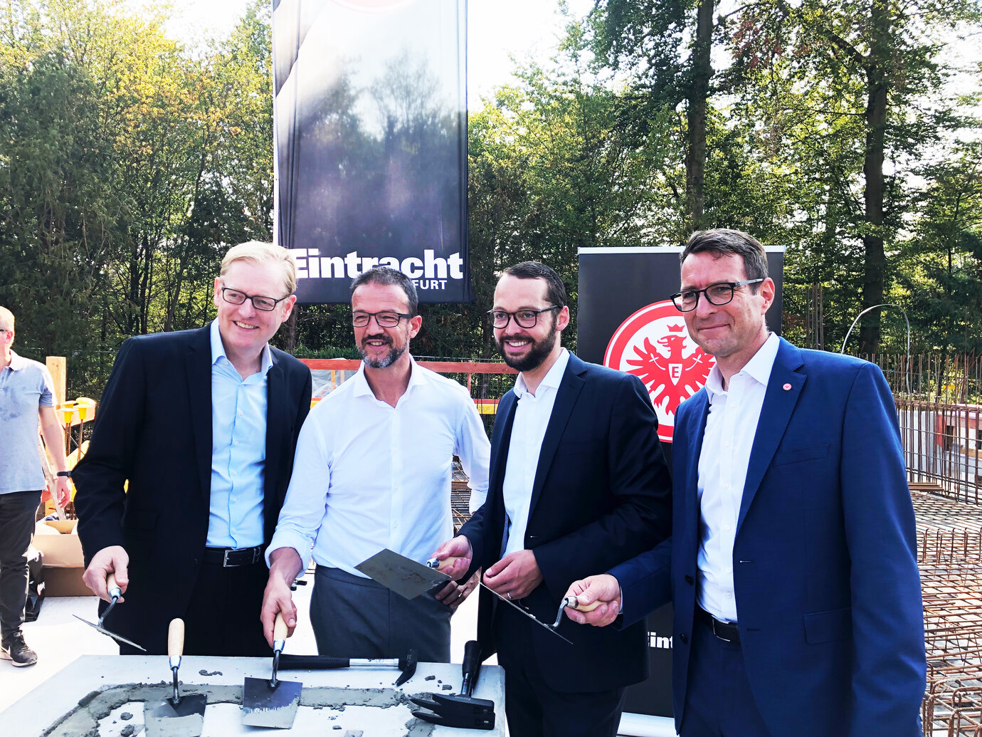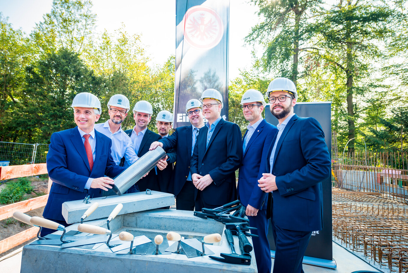 „Es ist auch für uns etwas ganz Besonderes, wenn das, was in der Theorie erdacht und geplant wurde dann Realität wird und Gestalt annimmt. Wir sind sehr stolz darauf, die Architekten dieses für die Eintracht so bedeutsamen Neubaus zu sein und freuen uns, einen wichtigen Beitrag zum Wachstum unseres Heimat-Fußballclubs zu leisten.“, so Axel Bienhaus, Geschäftsführer von AS+P beim Festakt vor Ort. Nach alter Tradition mauerte man sodann gemeinsam die Zeitkapsel mit der Gründungsurkunde und den Bauplänen in den Grundstein ein.