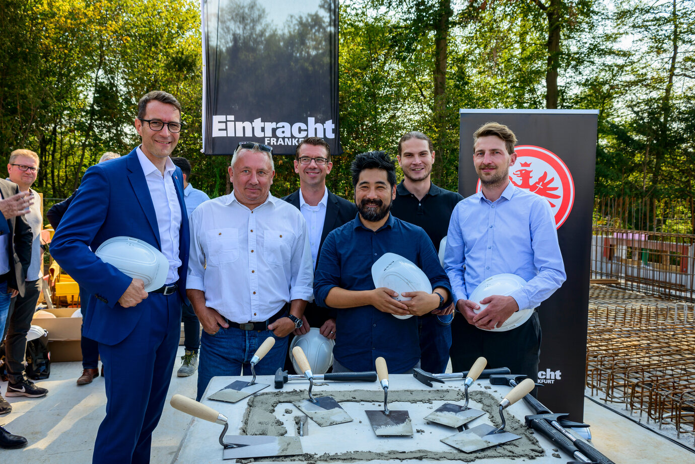 Von links: Peter Feldmann (Oberbürgermeister der Stadt Frankfurt am Main), Sportvorstand Fredi Bobic, Anton Schick (Bauunternehmer), Finanzvorstand Oliver Frankenbach, Vorstandsmitglied Axel Hellmann, Stadtrat Markus Frank, Axel Bienhaus (Geschäftsführer AS+P) und Stadtrat Jan Schneider. Foto © Eintracht Frankfurt Fußball AG | Ulrich Schepp