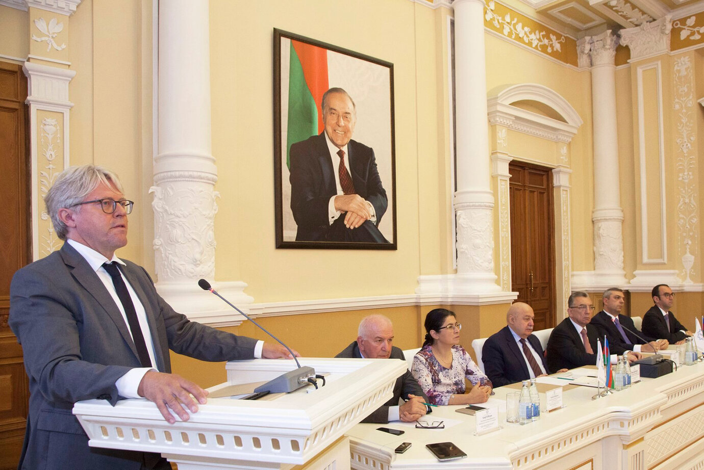Geschäftsführer Joachim Schares bei seiner Rede vor dem Plenum. © State Committee for Urban Planning and Architecture of the Republic of Azerbaidjan