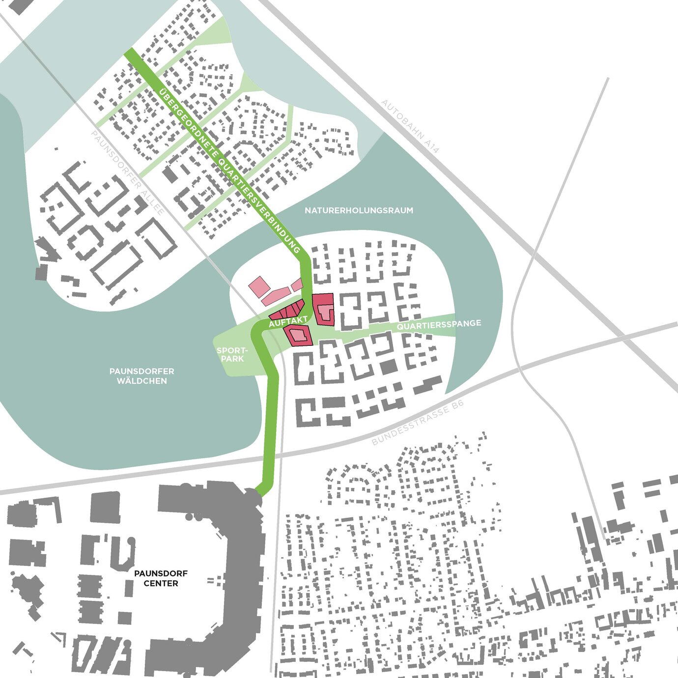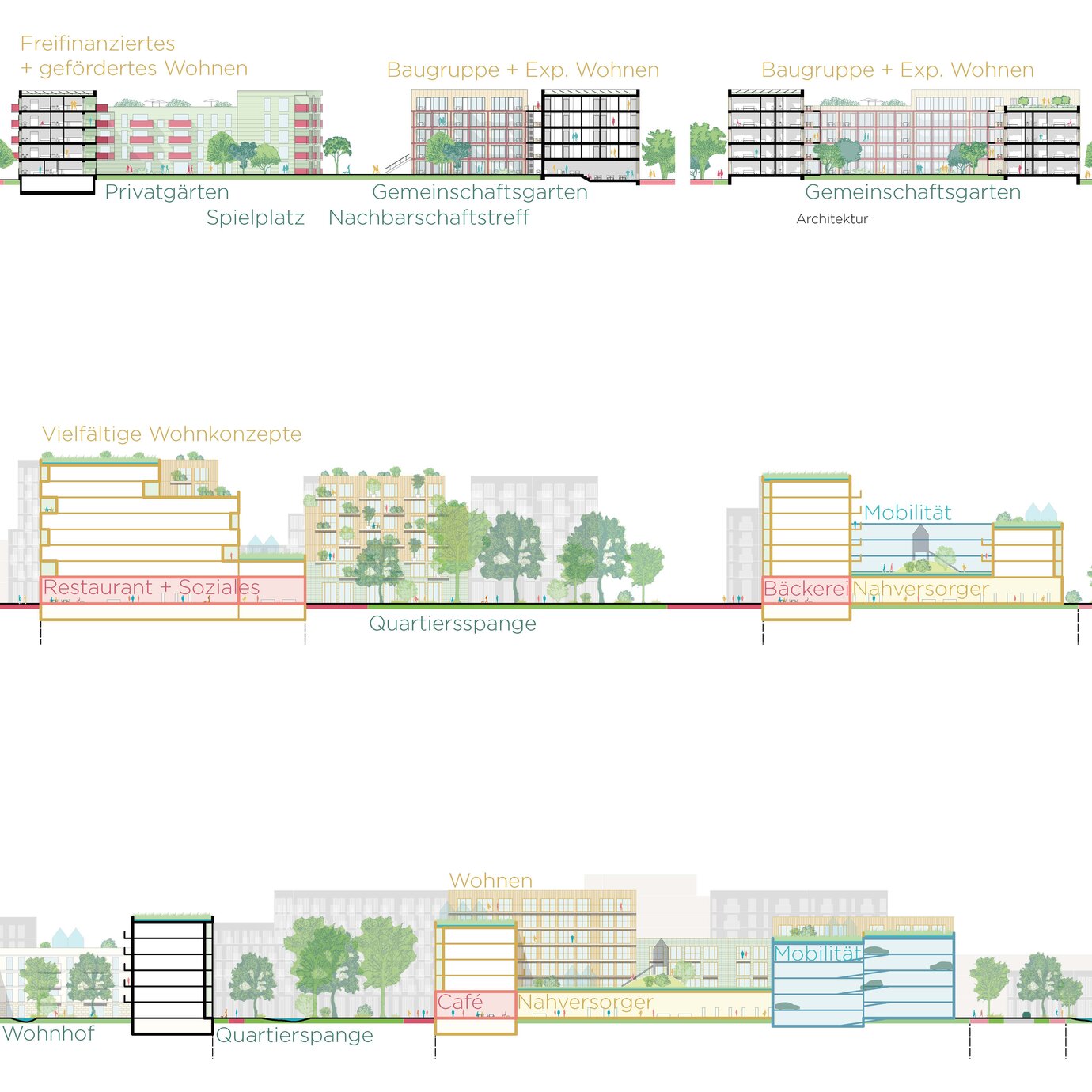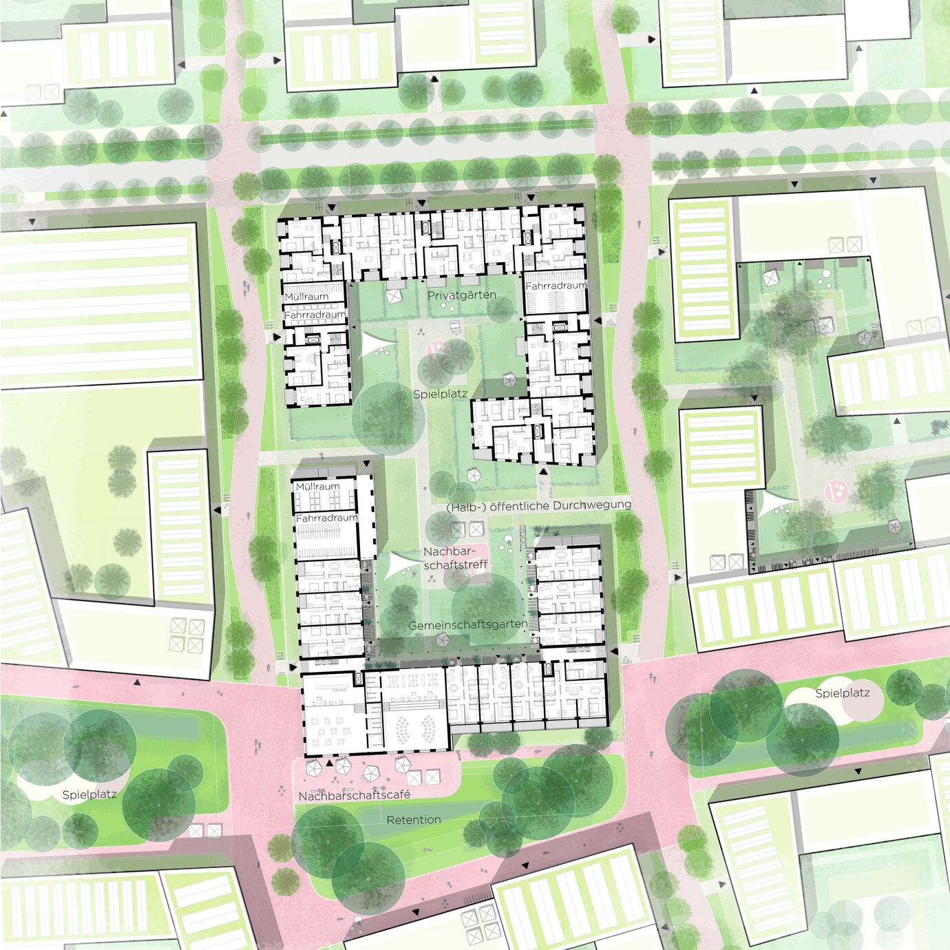 Das neue Stadtquartier enthält eine besonders flächensparende Blockstruktur, die sich zum attraktiven Landschaftsraum und den Nachbarquartieren hin auflöst. Maßstäblichkeit, Durchlässigkeit und Vernetzung stärken den sozialen Zusammenhalt und das Gemeinwohl. Den Auftakt bildet ein lebendiger Platzraum als Herz des Quartiers, als klare, spannungsvolle Adresse und als Gelenk. Das Gewerbeband im Süden sichert den Schallschutz und damit eine hohe Wohnqualität im dahinterliegenden Quartier.