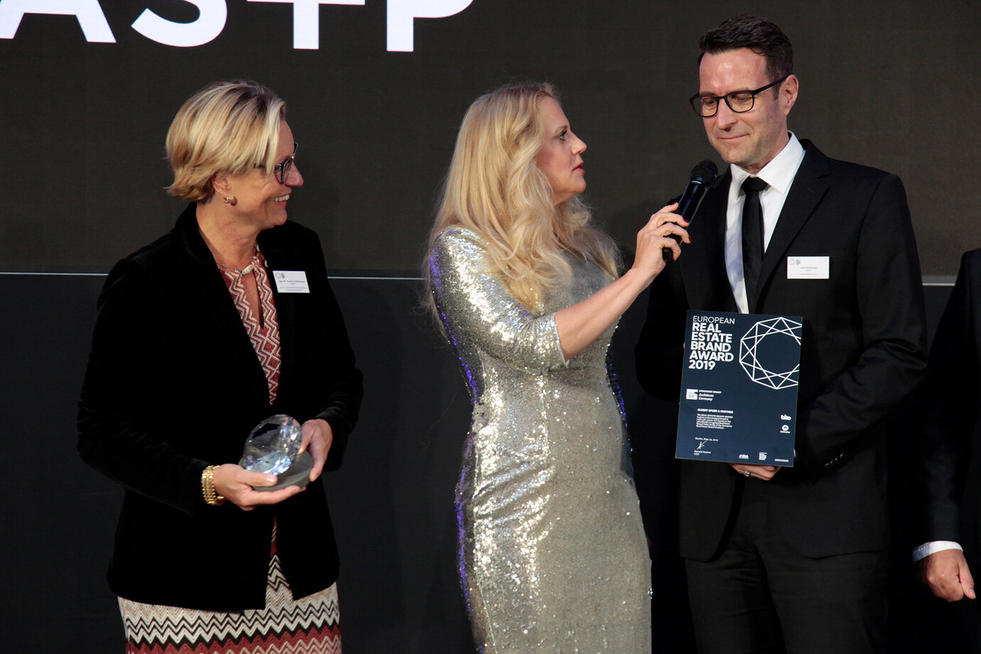 V. l. n. r.: Susanne Wellershaus, Barbara Schöneberger und Axel Bienhaus, © European Real Estate Brand Institute, Foto: HENRIK JORDAN