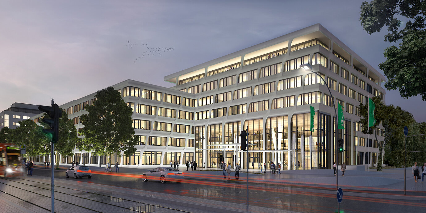 Das nach­hal­tige, effiziente Ensemble besteht aus mit drei miteinander verbundenen, fünf- bis siebengeschossigen Baukörpern und bildet einen erkennbaren Auftakt an der Berliner Straße. In seinem Inneren entsteht mit einer großen Konferenzzone und zahlreichen Tagungsräumen, einem Casino mit Großraumküche sowie einem modernen Mitarbeiterbereich mit multifunktional nutzbarem Sportraum ein kommunikatives Arbeitsumfeld für bis zu 1.000 Mitarbeiter.
