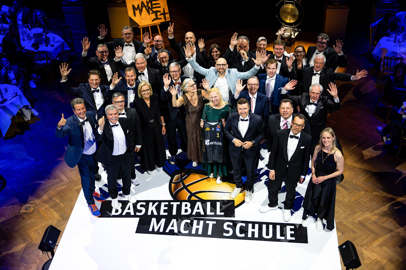 Mit großer Freude beteiligt sich AS+P auch in diesem Jahr am Projekt „Basketball macht Schule“ der Frankfurt Skyliners und motiviert so Kinder und Jugendliche zu mehr Bewegung, einem gesunden Lebensstil und fördert den sozialen Zusammenhalt. „Eine großartige Spendenaktion“, so Friedbert Greif | AS+P Albert Speer+ Partner GmbH (1. R, 2. v. l.) © Foto: florianwiegand.de