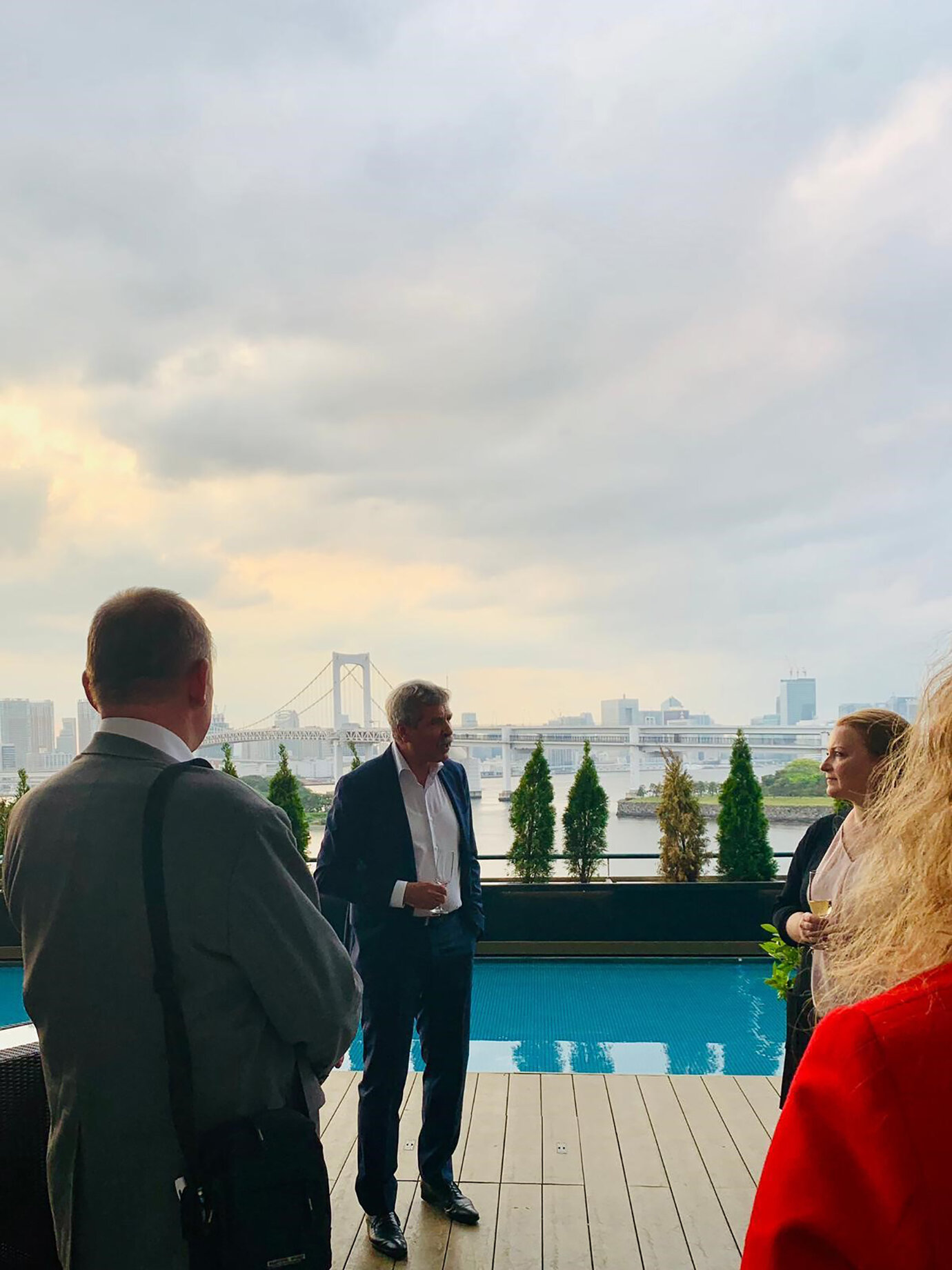 Eine herrliche Aussicht auf die abendliche Skyline von Tokyo erwartete die Gäste der DSM, die sich von Friedbert Greif, Geschäftsführer von AS+P, Daniel Ulrich, Assoziierter Partner und Architekt bei AS+P sowie Phillip Michler, Projektleiter bei PROPROJEKT, das Konzept des Deutschen Hauses im fünften Stock des Einkaufszentrums in Odaiba erläutern ließen. Odaiba ist ein Stadtviertel auf der künstlich errichteten Insel Daiba in der Tokyo Bay Zone. Dieser sorgsam gewählte Veranstaltungsort soll im Sommer des kommenden Jahres zur prominenten Fläche und zum begehrten Treffpunkt während der Olympischen und Paralympischen Spiele werden. Mit weitläufiger Terrasse, Pool und Blick auf die berühmte Rainbow Bridge bietet das Deutsche Haus im fünften Stock, neben anderen Flächen in der Mall, den Athleten, Medien, Partnern und Vertretern der Wirtschaft eine ideale Plattform zum Austausch, Entspannung und Feiern.