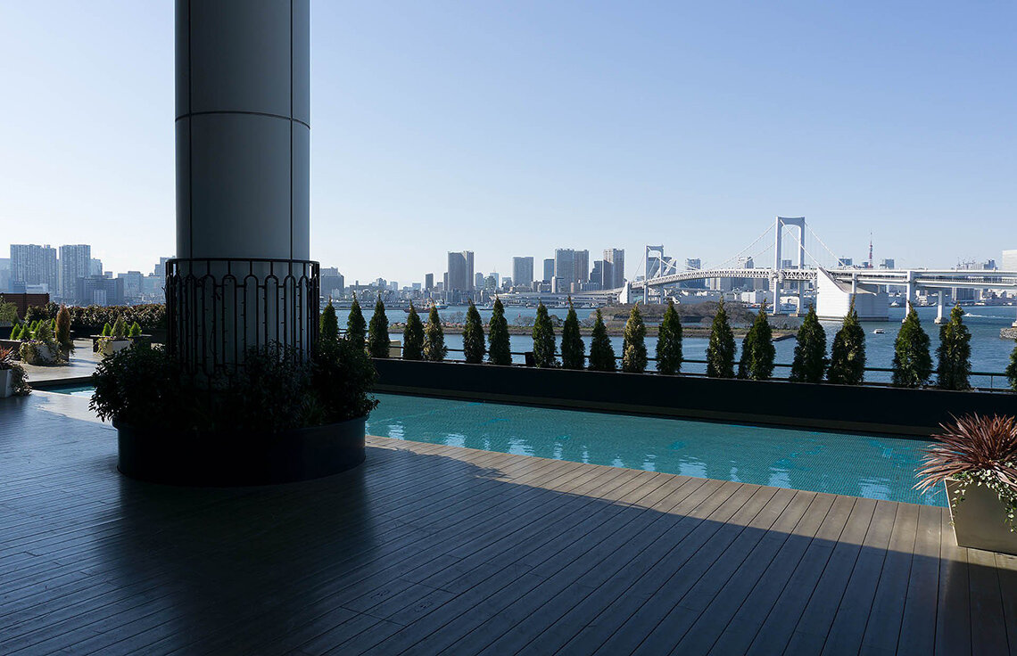Aussicht auf die Rainbow-Bridge: Friedbert Greif, Geschäftsführer von AS+P, auf der Dachterrasse der „Aqua City“-Mall.