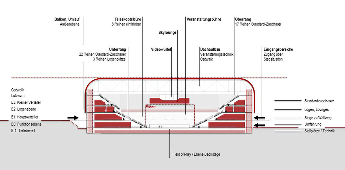Der erarbeitete Konzeptansatz für die neue multifunktionale Arena bietet in diesem Zusammenhang Platz für bis zu 15.000 Zuschauer und dient neben Sportveranstaltungen (Eishockey, Basketball) auch weiteren Veranstaltungsnutzungen (Konzert, Show, Event). Mit der Verortung einer Multifunktionsarena auf P9 geht die sicherheitsoptimierte Neuverortung des Gästeparkplatzes in unmittelbarer Randlage zum Gästesektor des Stadions, die Nutzungsintensivierung des Waldparkplatzes mittels einzelner Parkdecks sowie die barrierefreie Optimierung der bestehenden Fußgängerbrückenverbindungen über die Mörfelder Landstraße einher, wodurch der Deutsche Bank Park in seiner übergeordneten Bedeutung als Veranstaltungs- und Eventstandort gestärkt und nachhaltig weiterentwickelt wird.
