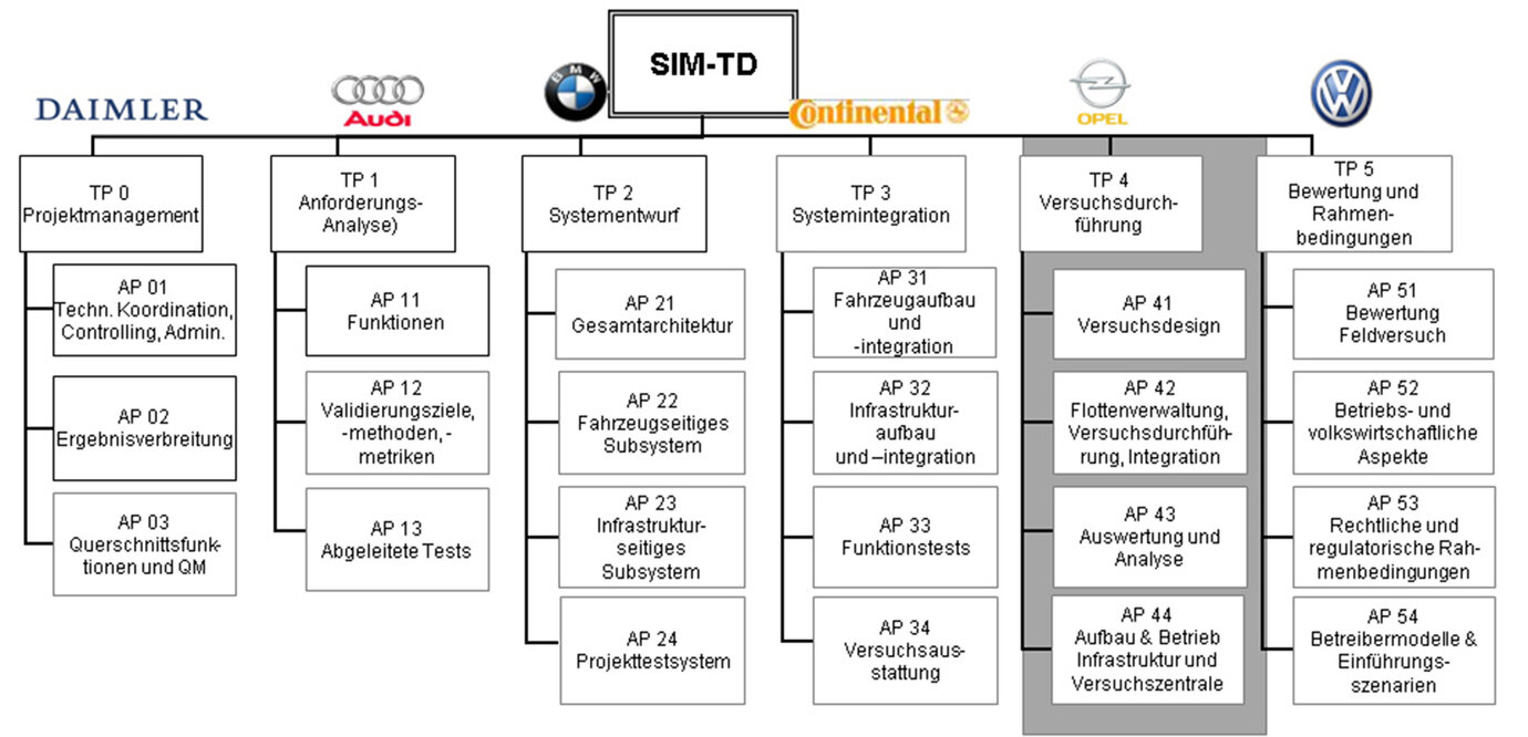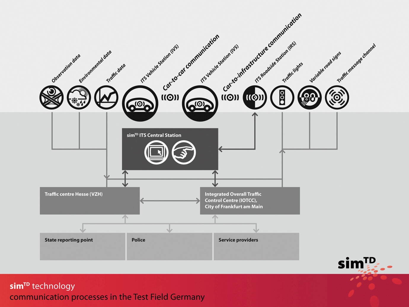 Das Forschungsprojekt simTD gestaltet durch die Erforschung und Erprobung der Car-to-X-Kommunikation und ihrer Anwendungen die sichere und intelligente Mobilität von morgen. Dazu werden zunächst realitätsnahe Verkehrsszenarien in einer Testfeld-Infrastruktur erprobt, um dann in einem groß angelegten Feldversuch in und um die hessische Metropole Frankfurt am Main die politischen, wirtschaftlichen und technologischen Rahmenbedingungen für eine erfolgreiche Einführung der Fahrzeug-zu-Fahrzeug- und Fahrzeug-zu-Infrastruktur-Vernetzung zu testen. Im Rahmen dieses Projektes ist AS+P Albert Speer + Partner GmbH im Auftrag der Stadt Frankfurt am Main für die Vorbereitung, Durchführung und Auswertung des groß angelegten Feldversuches zuständig. Aufgaben sind die Planung des Versuchsdesigns und der hierzu erforderlichen Infrastruktur, die Mitarbeit an der Versuchsdurchführung sowie die Auswertung und Analyse der Ergebnisse. Dabei stehen die für die Stadt Frankfurt am Main relevanten Gesichtspunkte wie verkehrliche Wirkung, nutzerorientierte Wirkung (z.B. Akzeptanz) sowie sicherheitsrelevante und technische Aspekte im Vordergrund.