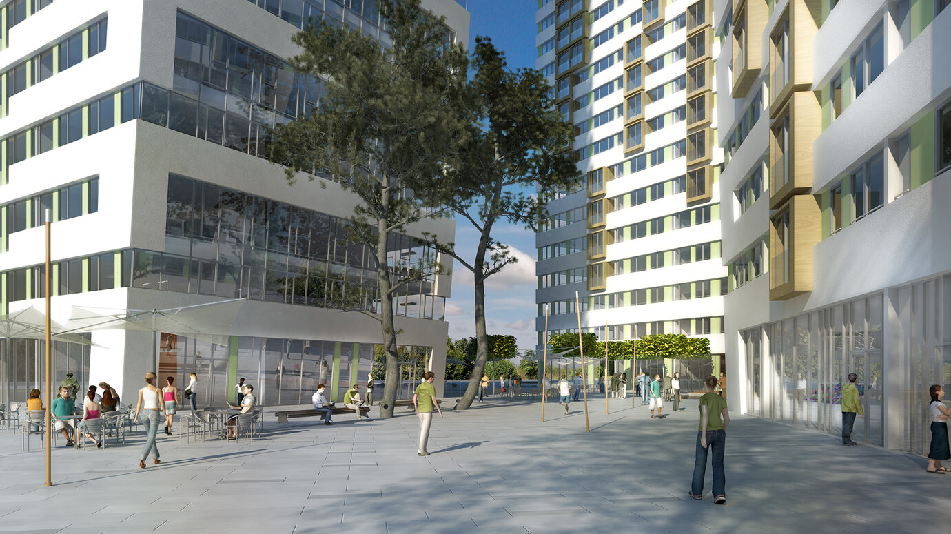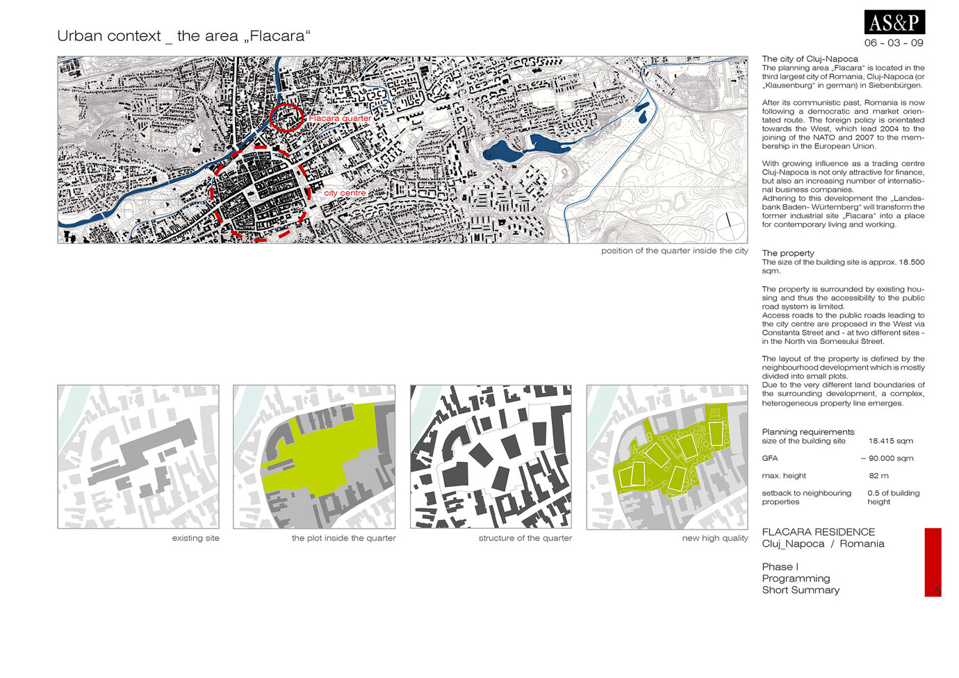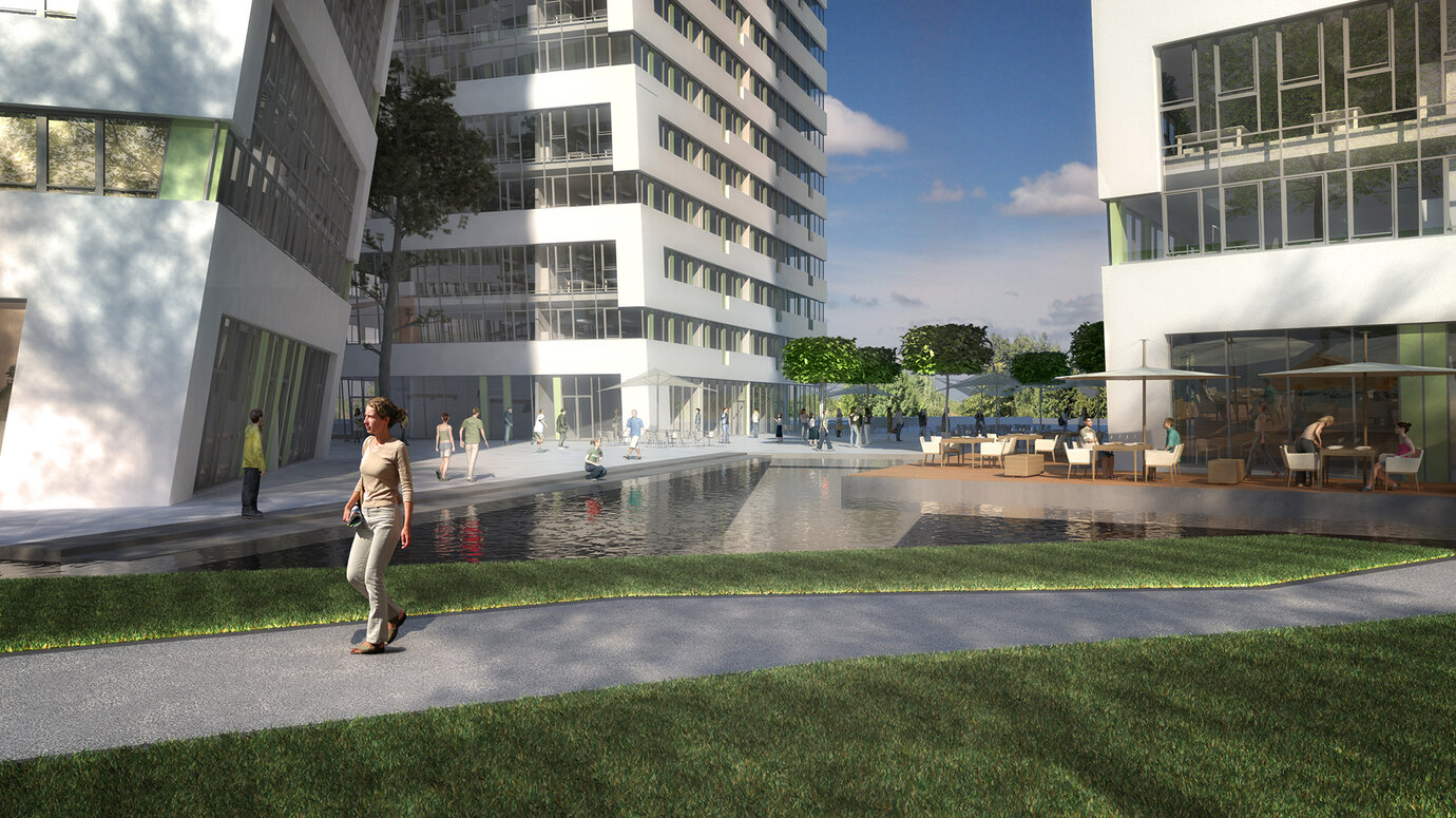 Die LBBW Immobilien hat im Zentrum der drittgrößten Stadt Rumäniens ein Grundstück erworben, das mit einer gemischten Nutzung aus Wohnen und Arbeiten entwickelt und mit höchstem architektonischem Anspruch bebaut werden soll. AS+P setzte sich in einem hochkarätig besetzten Wettbewerb mit einem Entwurf durch, der zu Gunsten der Qualität auf die maximale Grundstücksausnutzung verzichtete. Ein nachhaltiger Ansatz, der auch den Auftraggeber überzeugte. Fünf Hochhäuser mit unterschiedlichen Nutzungen, individuellen Ausrichtungen und eine aufeinander abgestimmte Höhenentwicklung prägen das "Flacara" Ensemble. Ein sehr wirtschaftlicher und flexibler Hochhaus-Grundtyp wurde entwickelt, der entsprechend der Nachfrage durch minimale Veränderungen allen Ansprüchen gerecht wird. Ein modernes Landschaftskonzept bietet die städtische Plattform, auf der sich die "Flacara Residence" präsentiert. Öffentliche und private Zonen wurden definiert, Wegebeziehungen zur angrenzenden Innenstadt eingeplant und eine hohe Aufenthaltsqualität dargestellt. In Zusammenarbeit mit einem ortsansässigen Architekturbüro wurde die Genehmigungsplanung in einem sehr engen Zeitrahmen erfolgreich durchgeführt.