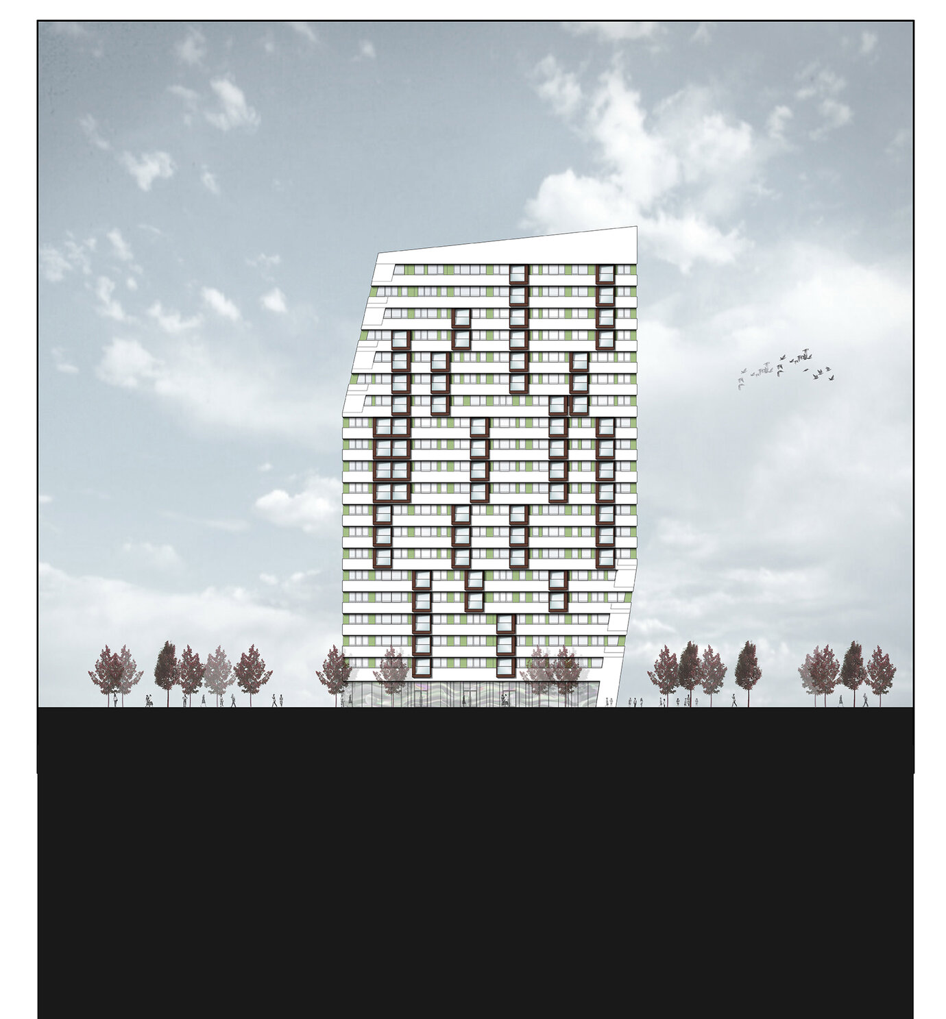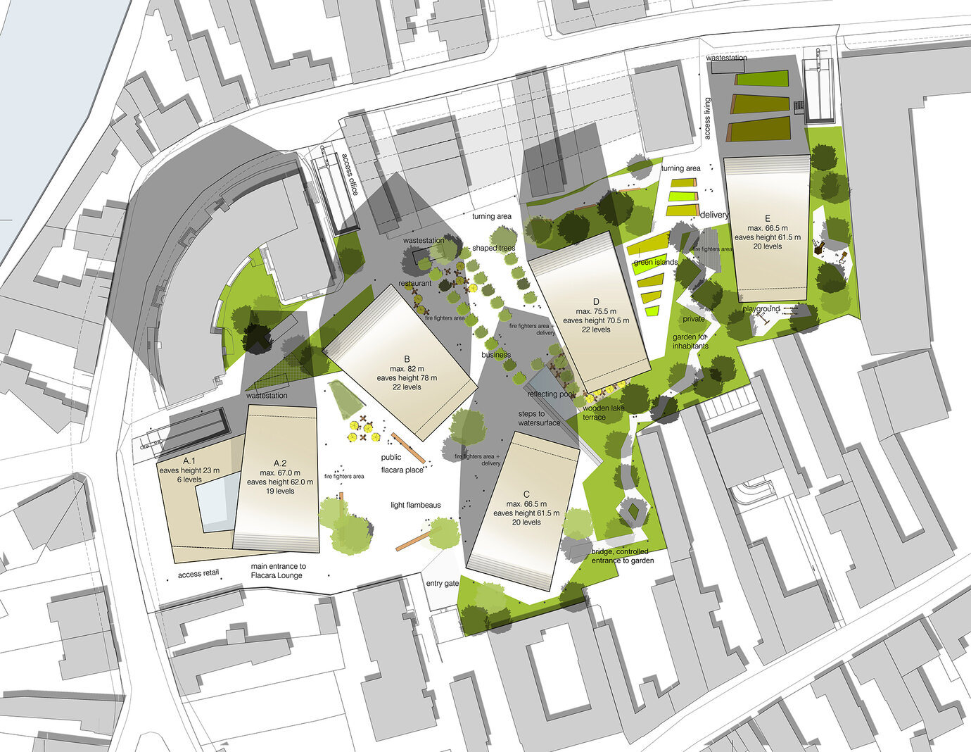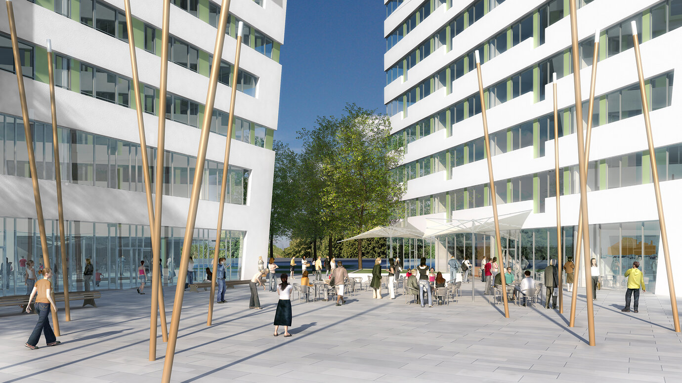Die LBBW Immobilien hat im Zentrum der drittgrößten Stadt Rumäniens ein Grundstück erworben, das mit einer gemischten Nutzung aus Wohnen und Arbeiten entwickelt und mit höchstem architektonischem Anspruch bebaut werden soll. AS+P setzte sich in einem hochkarätig besetzten Wettbewerb mit einem Entwurf durch, der zu Gunsten der Qualität auf die maximale Grundstücksausnutzung verzichtete. Ein nachhaltiger Ansatz, der auch den Auftraggeber überzeugte. Fünf Hochhäuser mit unterschiedlichen Nutzungen, individuellen Ausrichtungen und eine aufeinander abgestimmte Höhenentwicklung prägen das "Flacara" Ensemble. Ein sehr wirtschaftlicher und flexibler Hochhaus-Grundtyp wurde entwickelt, der entsprechend der Nachfrage durch minimale Veränderungen allen Ansprüchen gerecht wird. Ein modernes Landschaftskonzept bietet die städtische Plattform, auf der sich die "Flacara Residence" präsentiert. Öffentliche und private Zonen wurden definiert, Wegebeziehungen zur angrenzenden Innenstadt eingeplant und eine hohe Aufenthaltsqualität dargestellt. In Zusammenarbeit mit einem ortsansässigen Architekturbüro wurde die Genehmigungsplanung in einem sehr engen Zeitrahmen erfolgreich durchgeführt.