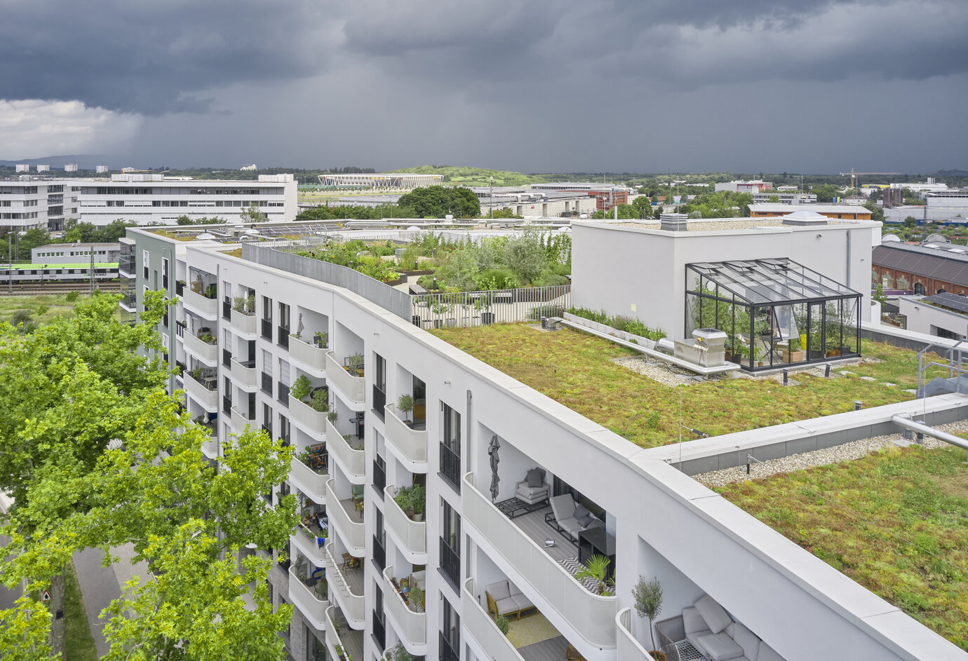 Die Freianlagen sind mit einem aufwendigen Dachgarten mit Pergolen und einem Gewächshaus sowie einem Innenhof mit Unterständen und Spielplätzen gestaltet.