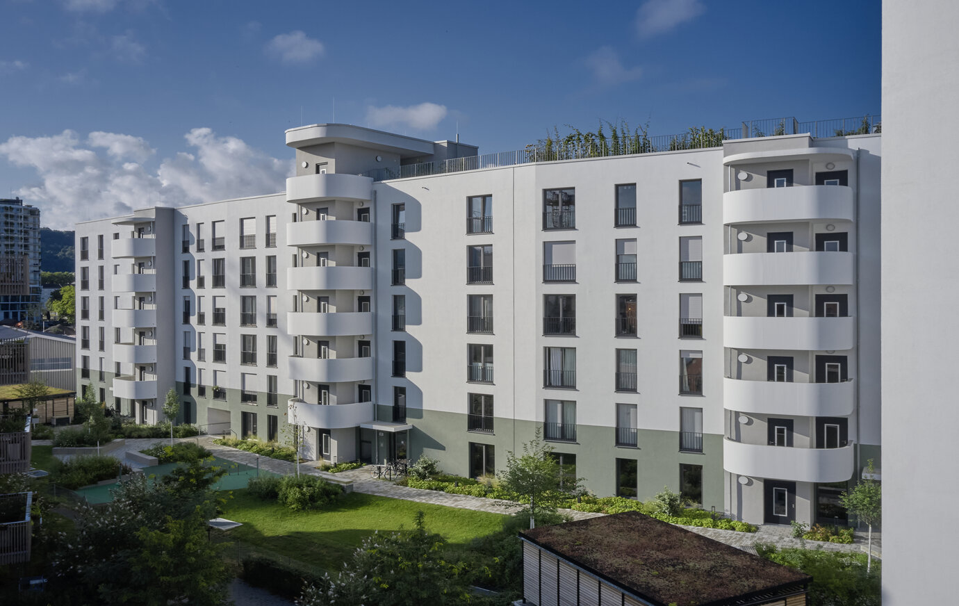Gemischt genutzte Bebauung mit 80 Wohnungen und 5 Gewerbeeinheiten im EG auf einer gemeinsamen Tiefgarage